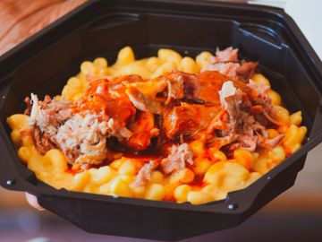 Homemade mac-n-cheese, topped with your selection of Pulled Pork, Beef Brisket or Shredded Chicken and covered in BBQ sauce. (add $1.00 for beef)