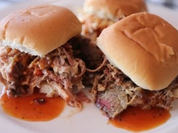 3 Slider buns piled high with your choice of pulled pork, hot link, shredded chicken and beef brisket. (add .50 per slider for beef)